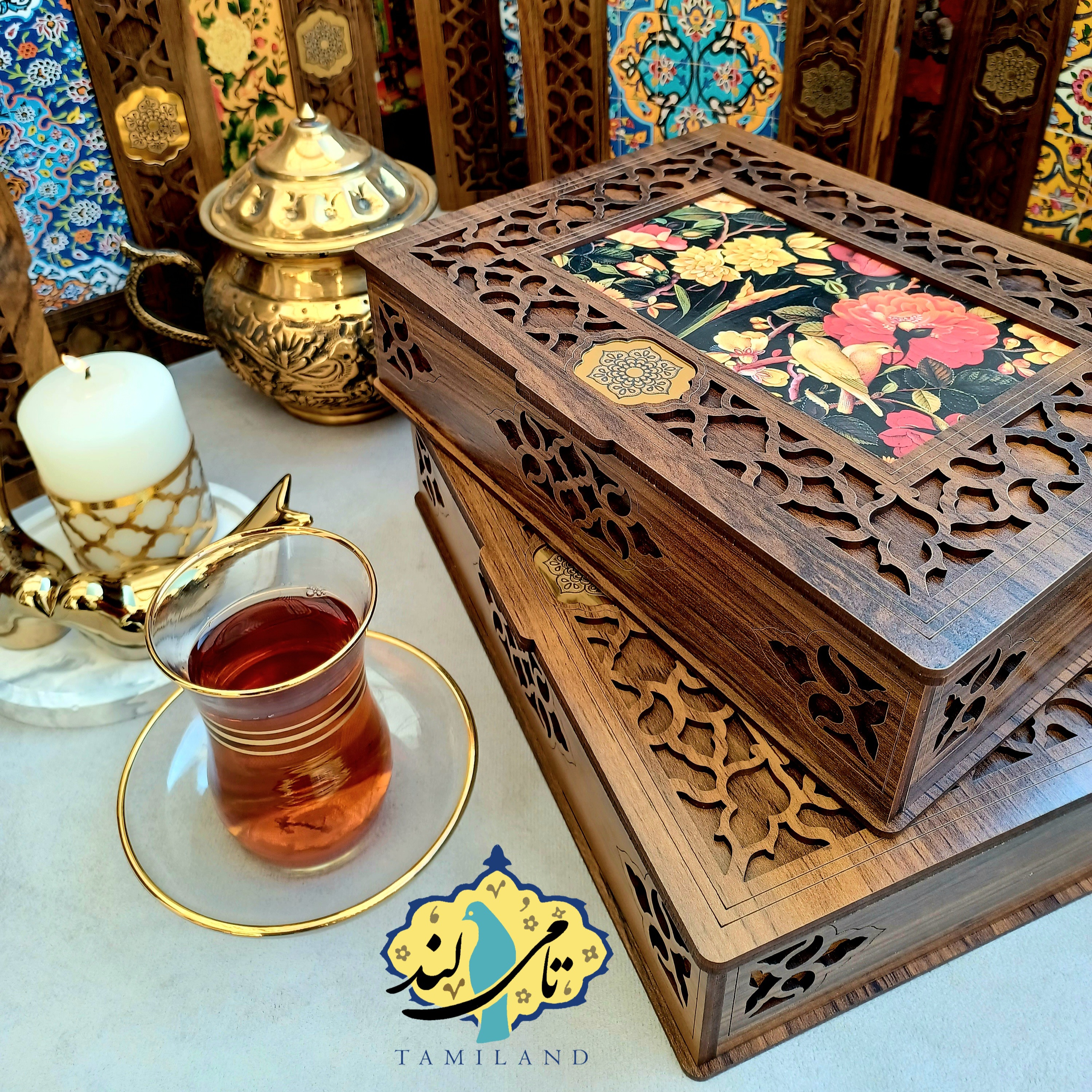 جعبه های چوبی طراحی و تولید شده در مجموعه ی تامی لند با در نظر گرفتن کاربرد، سلایق گوناگون و ترکیب آن با نیاز جامعه، ظاهر و کیفیت مطلوبی در مقایسه با محصولات مشابه موجود در بازار داشته و استفاده از یراق فلزی در سیستم درب جعبه، کیفیت محصول را دو چندان کرده است.جعبه تنقلات شش خانه ی گلشن یکی از محصولات پرفروش از سری جعبه های دمنوش و تنقلات در حوزه ی کاربرد شخصی، تبلیغاتی و بسته بندی می باشد. برای سفارش این محصول می توانید از تصاویر شماره دار ، شماره ی تصویر مورد نظر را انتخاب کنید.برای انتخاب محصول به سبد خرید حتما گزینه ی ویژگی محصول انتخاب شود.